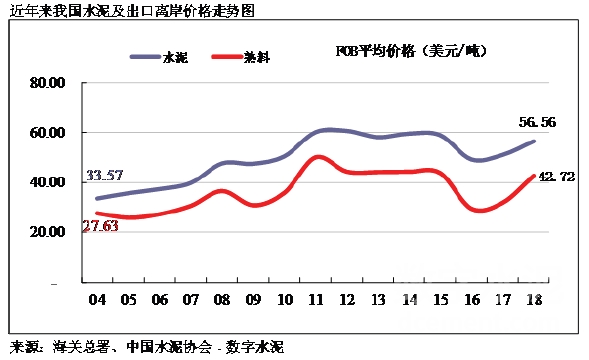 自2006年水泥出口達到高峰的3,612萬噸以后,我國水泥出口量呈明顯逐年下降趨勢,主要原因:一是我國出口政策的調(diào)整,2007年國家取消了11%出口退稅的優(yōu)惠政策。二是國際市場需求疲軟,水泥需求缺口縮小,尤其是原來我國出口大戶美國房地產(chǎn)業(yè)投資大幅下滑,導(dǎo)致其進口水泥大幅度縮減。2018年出口量僅為904萬噸,這是自2005年以來首次跌破1000萬噸,但出口的FOB價格連續(xù)三年回升,2018年達到56.6美金。